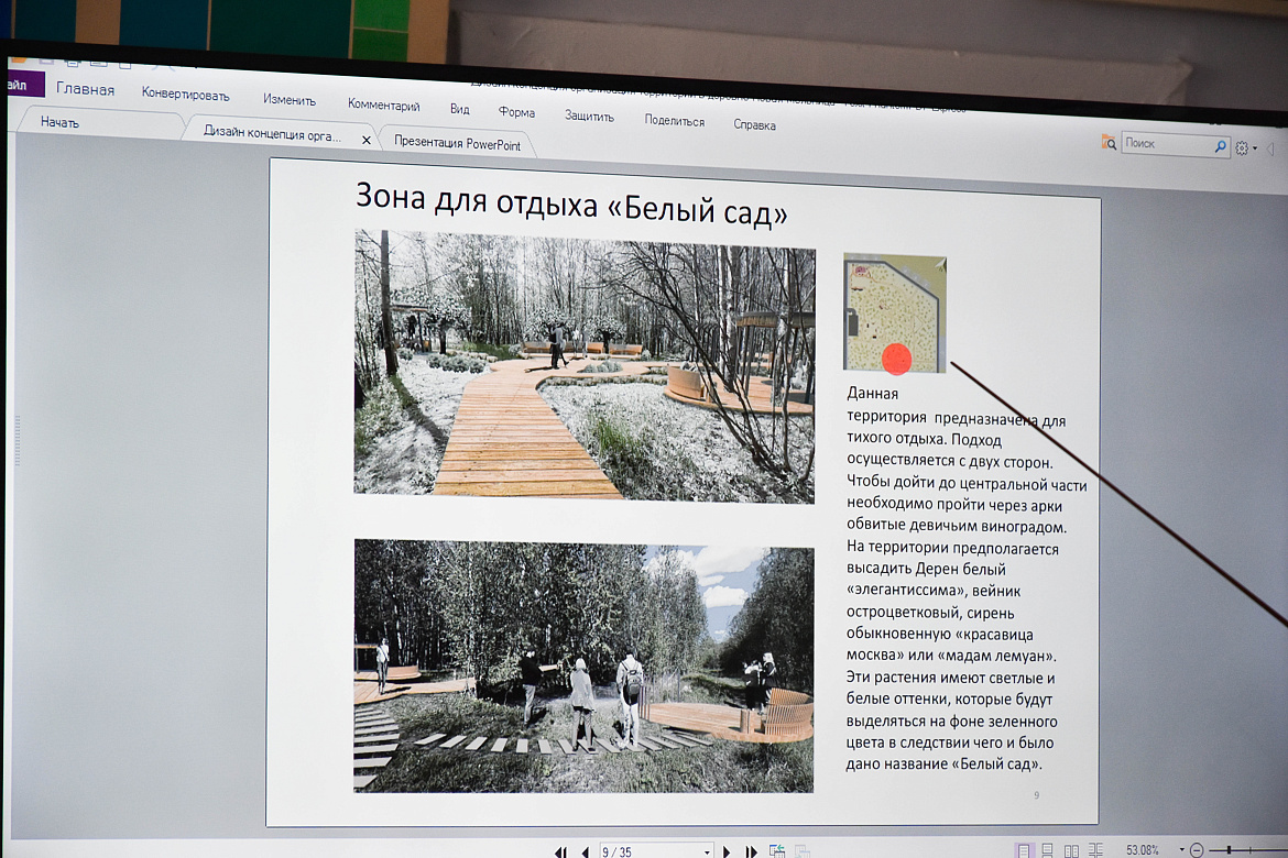 Всего представили два проекта. По первому на территории парка авторы предлагают создать фотозону, зоны тихого отдыха со скамейками и беседками, аллею качелей, площадку с тренажерами, парковку на 33 места, площадку для выгула и дрессировки собак, веревочный городок. Также проект предполагает зону пикников со специально организованными местами для развода костров, вело и скейт площадки.