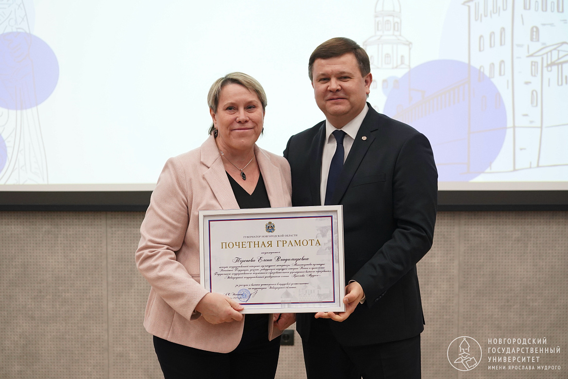 Нагрудным знаком «Почётный наставник» была награждена старший преподаватель кафедры иностранных языков, перевода и межкультурной коммуникации Вера Данилова. Девять человек получили почётное звание «Заслуженный работник НовГУ»: эксперт кафедры внутренних болезней Алла Иванова, доцент кафедры госпитальной хирургии Павел Певзнер, профессор кафедры проектирования и технологии радиоаппаратуры Владимир Петров, доцент кафедры прикладной математики и информатики Михаил Токмачёв, ведущий программист отдела цифровых технологий управления университетом Елена Горбачёва, делопроизводитель отдела организации приёма Центра дополнительного образования детей «Дом научной коллаборации» Елена Платонова, диспетчер транспортного отдела Марина Тютикова, ведущий специалист по гражданской обороне отдела гражданской обороны и чрезвычайных ситуаций Ирина Юдинцева, ветеран НовГУ Нина Хорунжий.