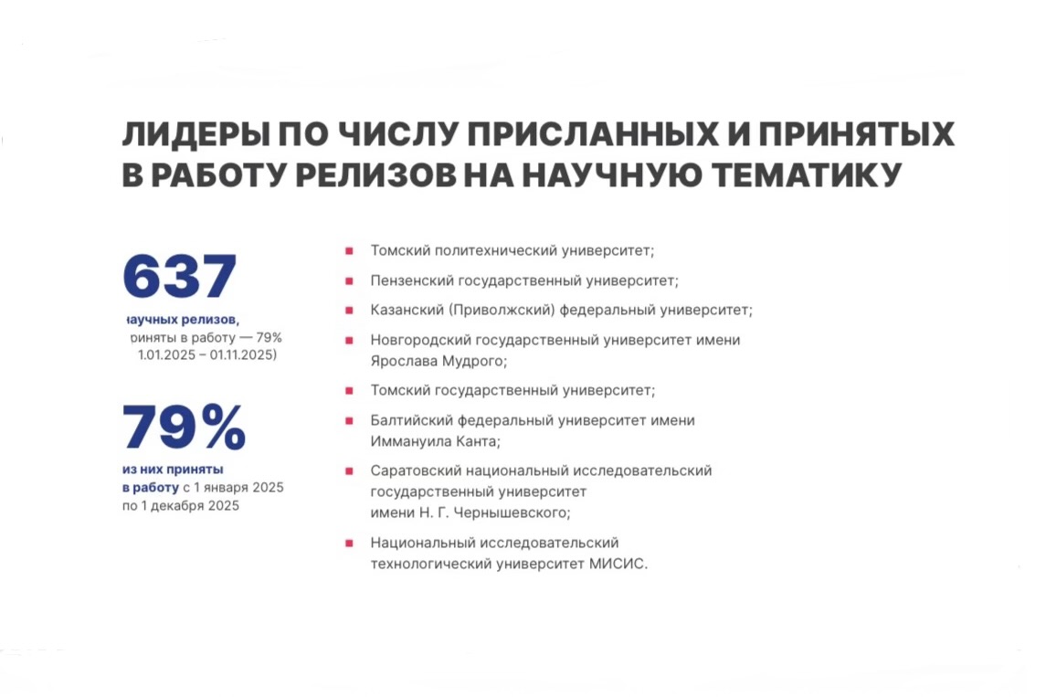 НовГУ вошёл в пятёрку лучших по двум показателям. Первый из них — «Лидеры по числу присланных и принятых в работу релизов на научную тематику». НовГУ занял четвёртое место, уступив Томскому политехническому университету, Пензенскому государственному университету и Казанскому (Приволжскому) федеральному университету.