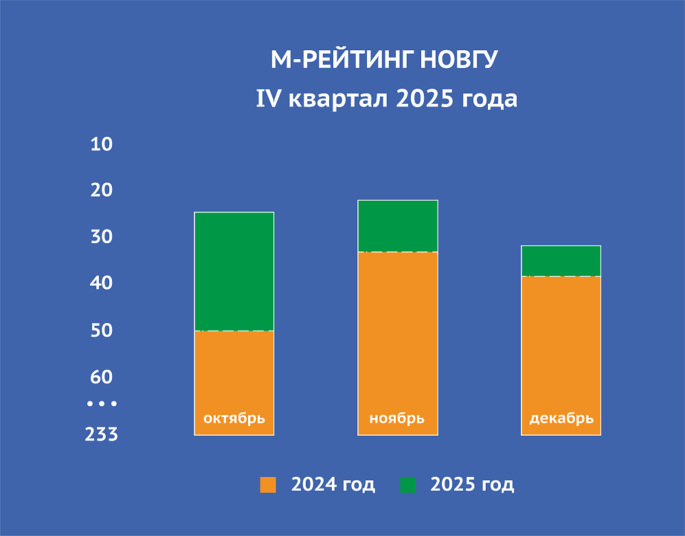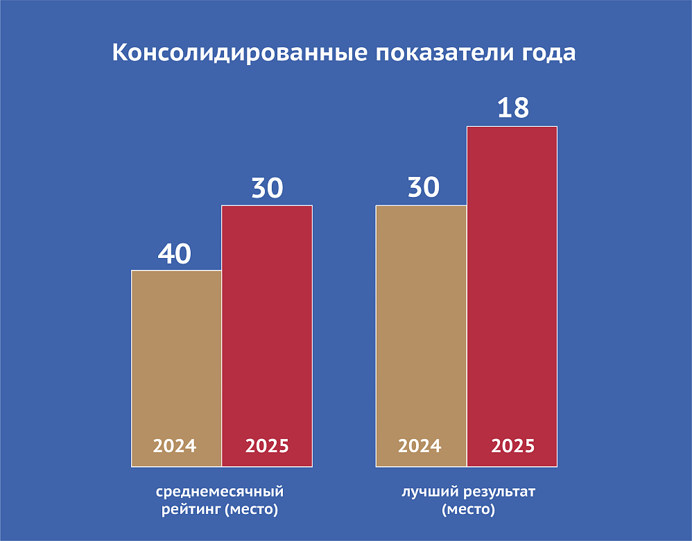 — В первой половине 2023 года Новгородский университет находился на уровне топ-80. После того, как в мае 2023 работа Управления информации была перестроена, начался планомерный рост, — отметил начальник Управления информации и коммуникационной политики НовГУ Станислав Дидковский. — В 2024 году мы вышли на стабильно хорошие позиции, 8 месяцев из 12 находясь в топ-40 и выше. В 2025-м изо дня в день продолжали становиться «лучшей версией себя», соревнуясь с собственными достижениями и постоянно улучшая результат. О том, насколько это получилось, говорит простой факт: если в 2024 году 30 место в рейтинге было нашим наивысшим достижением, то в 2025 это среднемесячный показатель, а лучшим результатом стало 18-е место.