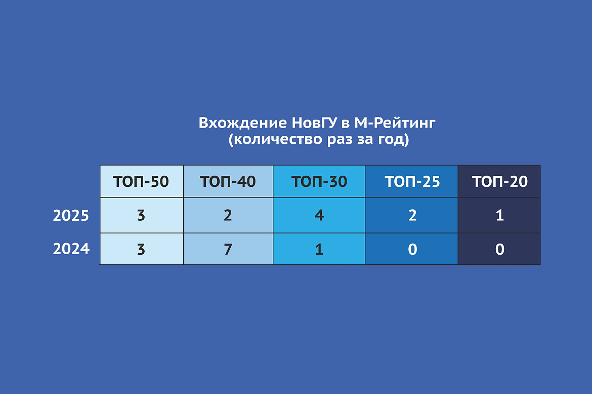 По итогам 2025 года среднемесячная позиция НовГУ в рейтинге медиаактивности вузов Минобрнауки РФ — 30 место. По сравнению с 2024 годом университет показал рост на 10 пунктов.