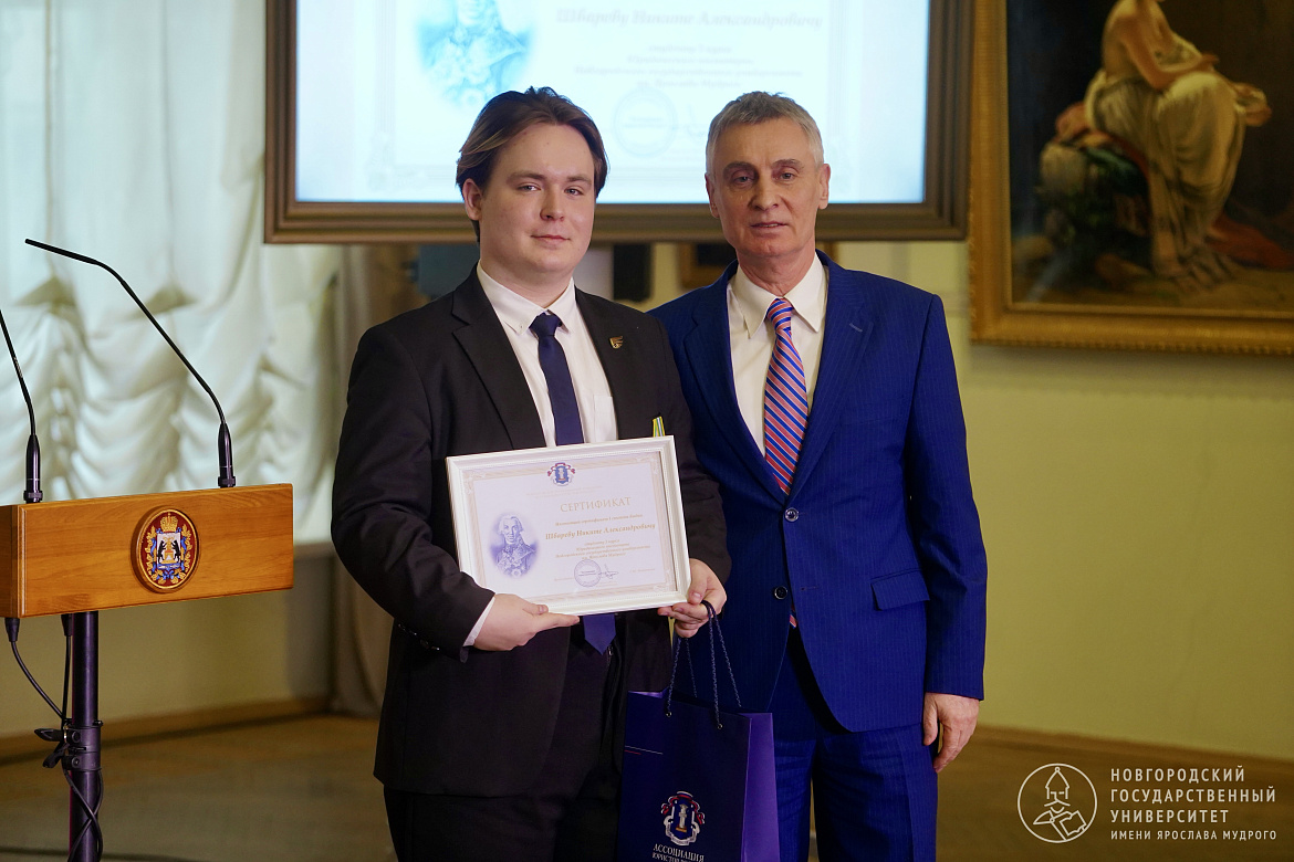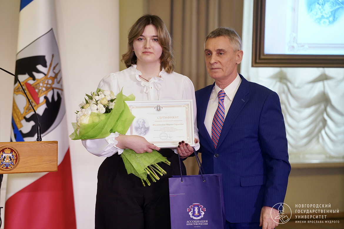 По сложившейся традиции именные стипендии получили трое студентов Новгородского университета за научную деятельность и общественную активность. Стипендиатами российской национальной юридической премии имени Гавриила Державина стали третьекурсники Юридического института НовГУ. Сертификатами I, II и III степени отметили Никиту Шварёва, Марию Торицыну и Марию Филиппову.