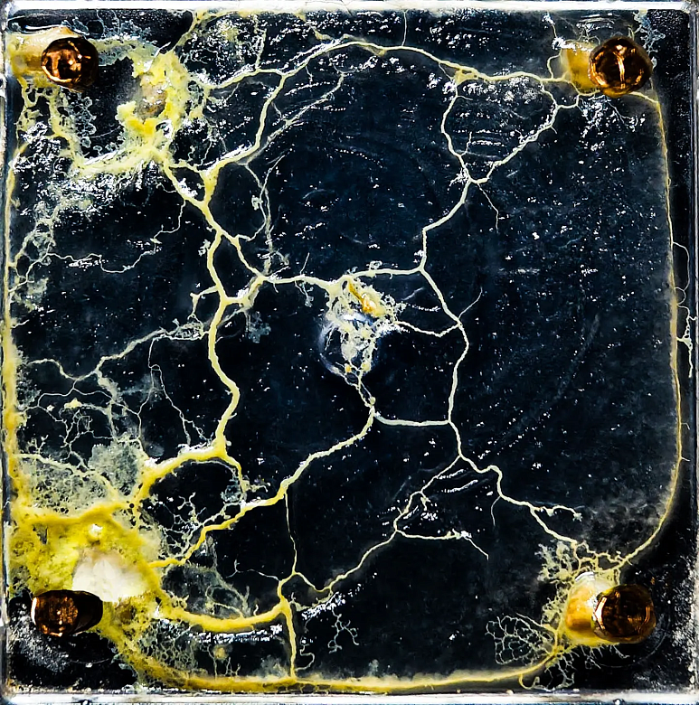 Для эксперимента выбрали вид слизевика Physarum polycephalum. Целью было попытасться с помощью слизевика решить задачу Штейнера для четырёх точек. Это классическая задача о поиске кратчайшей сети, соединяющей четыре заданные точки. Спойлер: периметр четырёхугольника, образованного этими точками — неправильное решение. Диагонали четырёхугольника — тоже.