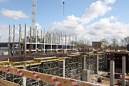 Сейчас рабочие возводят несущие и ограждающие конструкции зданий. В пяти жилых корпусах уже строят третий этаж. Параллельно на первых этажах монтируют лестницы, обустраивают внутренние и наружные стены, заливают полы и перекрытия, бетонируют стены. Продолжается строительство первого этажа многофункционального комплекса.