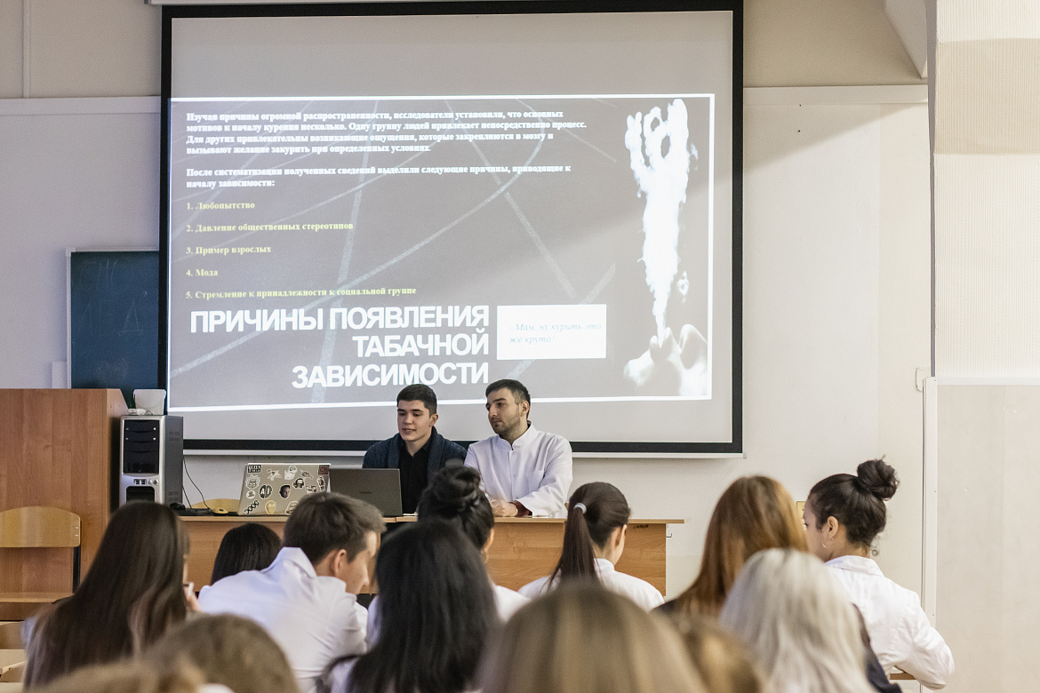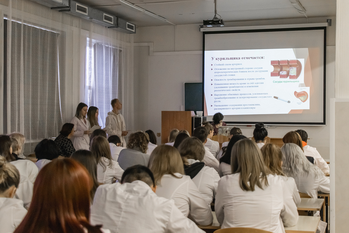 Студенты второго курса специальностей «лечебное дело» и «стоматология» рассказали о влиянии курения на сердце, мозг и сосуды, динамике развития наркомании, токсикомании и табакокурения.