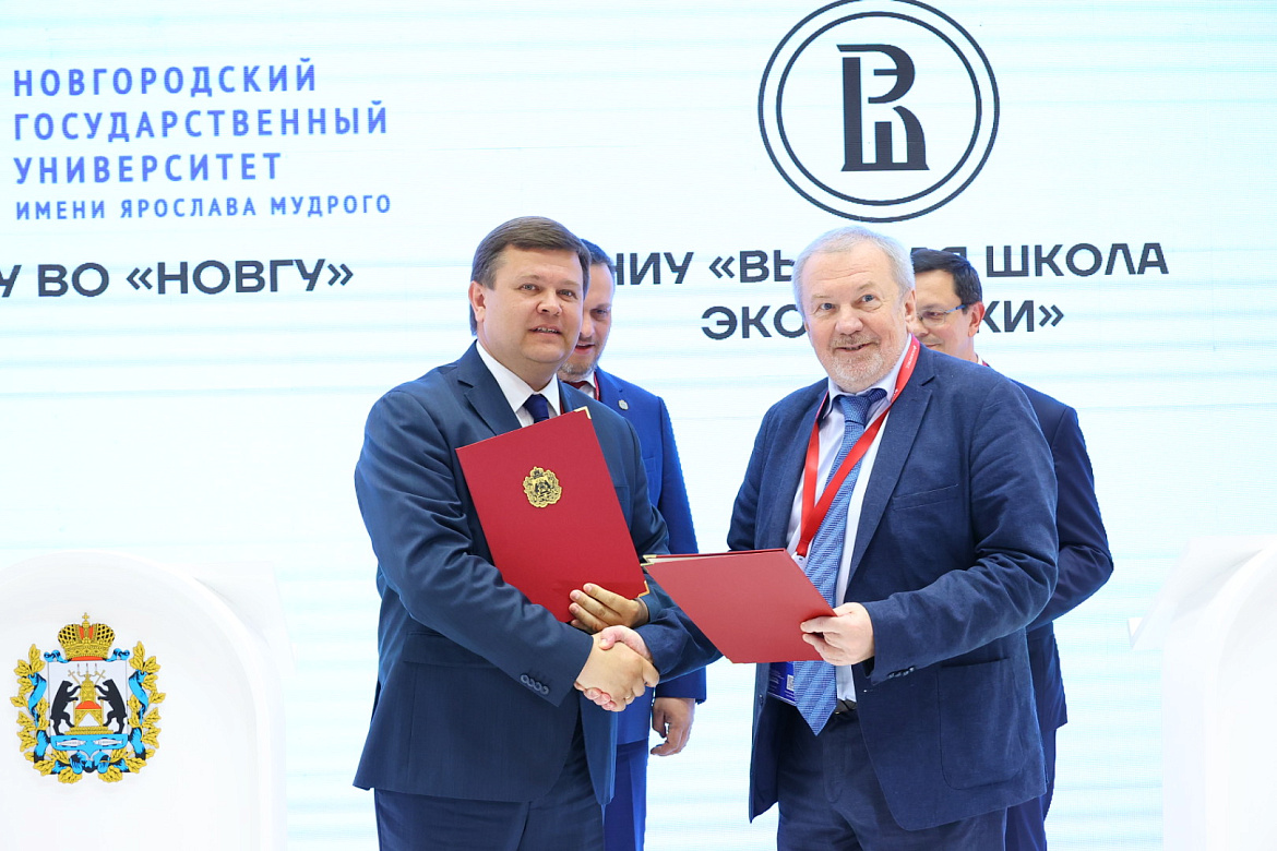 Соглашение о сотрудничестве на Петербургском международном экономическом форуме заключили Новгородский университет и «Высшая школа экономики». Документ подписали ректор НовГУ Юрий Боровиков и декан факультета коммуникаций, медиа и дизайна ВШЭ Андрей Быстрицкий.