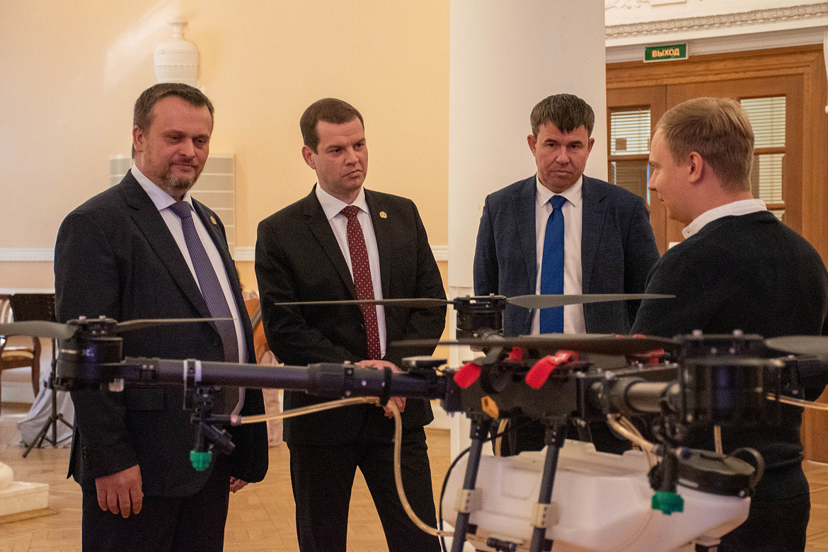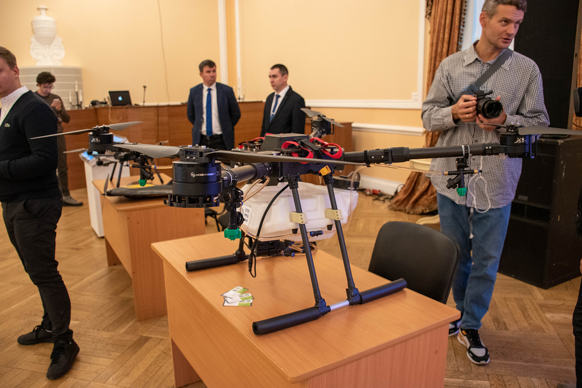 На выставке был представлен проект НовГУ по применению беспилотников и информационных систем в сельском хозяйстве. Ещё три беспилотных летательных аппарата привезли специалисты Санкт-Петербургского федерального исследовательского центра Российской академии наук.