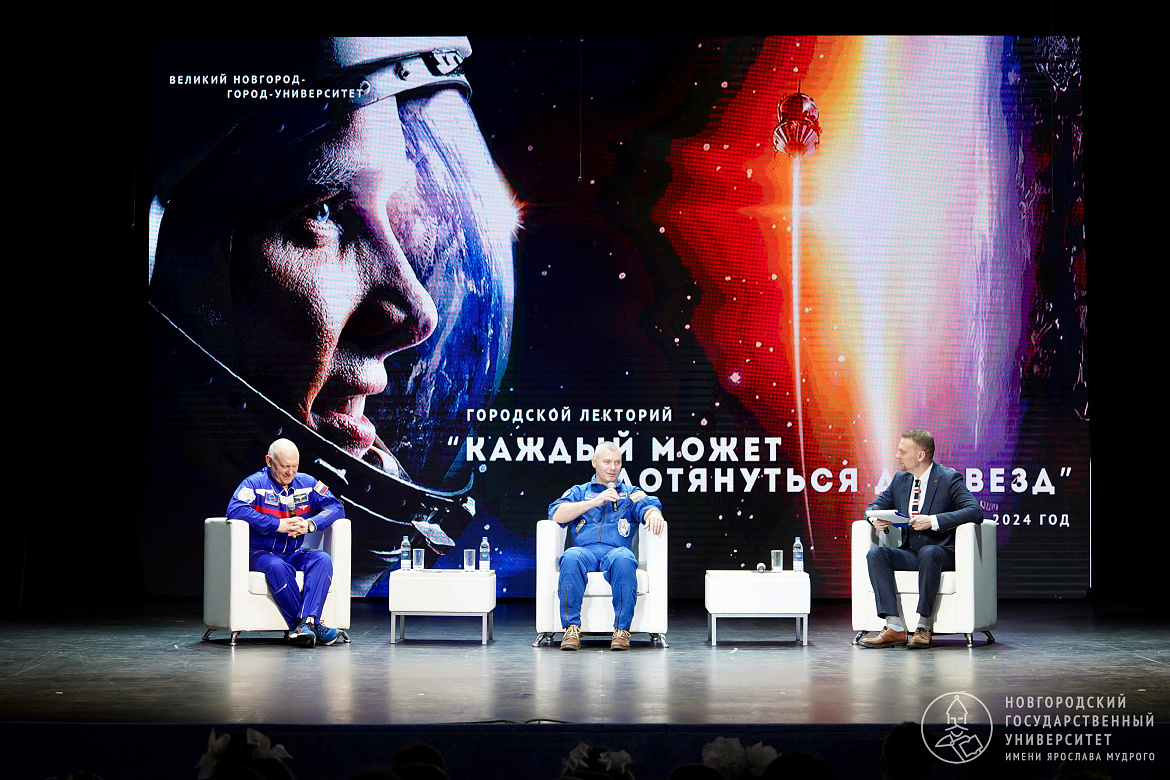 Центральным событием стал «Городской лекторий» в Новгородской областной филармонии. В формате открытого диалога с горожанами, школьниками и студентами НовГУ беседовали Герои Российской Федерации — космонавты Денис Матвеев и Олег Артемьев.