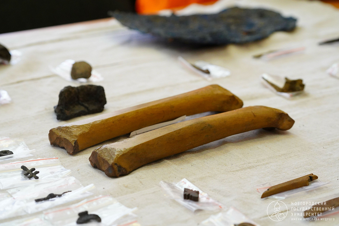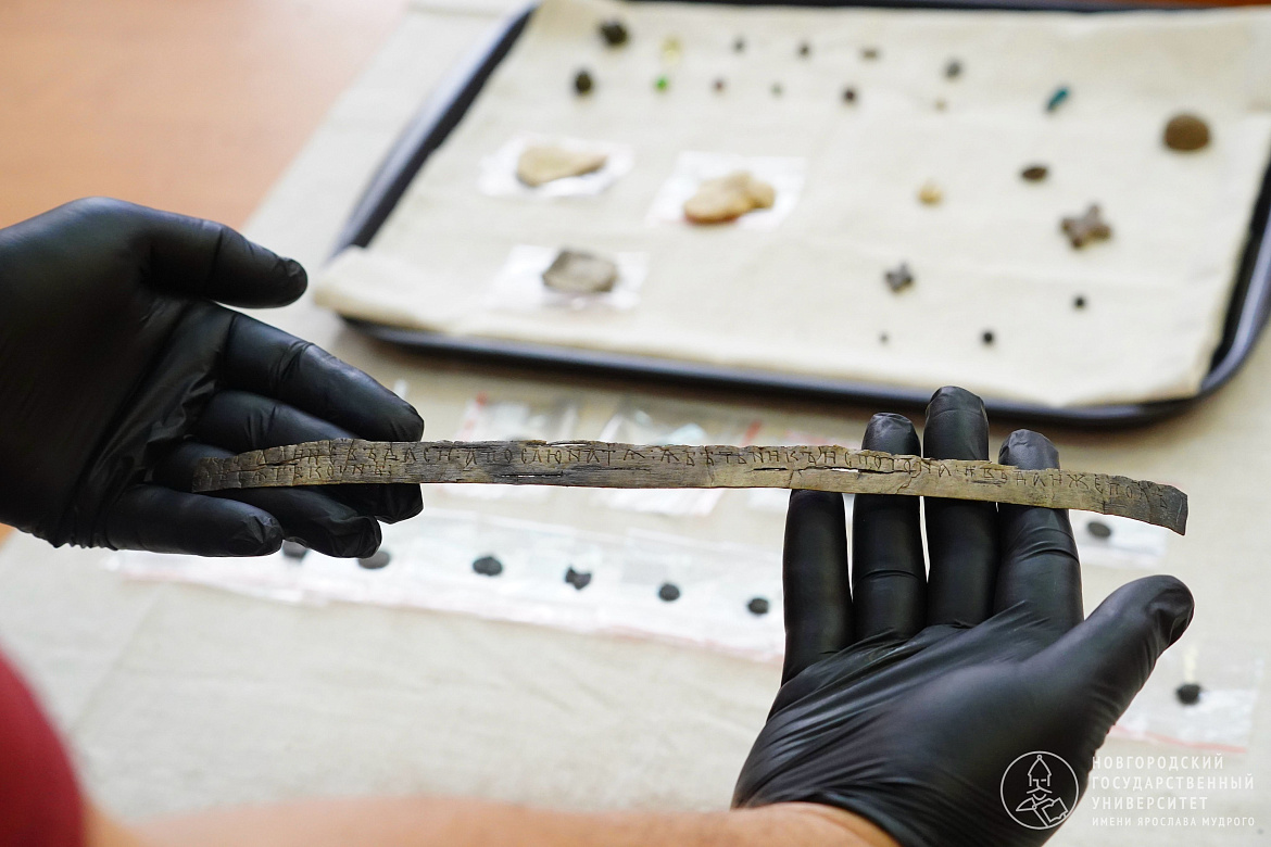 Традиционно на раскопе много костяных находок. Интересной находкой стал фрагмент резной костяной ложки. Есть предположение, что она сделана в североевропейской традиции и была привезена в Старую Руссу из Скандинавии или изготовлена здесь иностранным мастером.