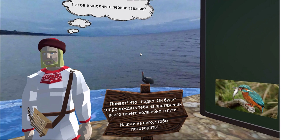 Виртуальная игра состоит из заданий, которые выдает новгородский былинный герой Садко. Он помогает игроку и направляет его. Например, просит выловить рыбу, параллельно знакомя с местной флорой и фауной, отсортировать улов по видам рыб — картинкам, где даётся справочная информация, или провести раздельный сбор мусора, в процессе которого дети рассматривают окаменелости брахиопод и других представителей девонского периода, представленные здесь.
