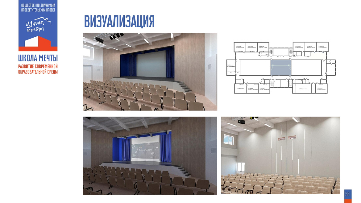 Ключевой задачей было обновление сцены актового зала — как отметили авторы проекта, её планировка устарела и не соответствовала новым запросам школьников и педагогов.