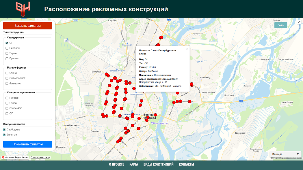 В отличие от существующих карт эта разработка демонстрирует самые точные официальные данные. Она создана на основе документов администрации города, главного органа, курирующего согласование законности размещения таких установок в населённом пункте. Для сравнения: карты одного из крупнейших операторов наружной рекламы по Новгородской области отображают только конструкции данной компании. А данные на картах федеральных агрегаторов не всегда соответствуют действительности: они не успевают так быстро обновляться.