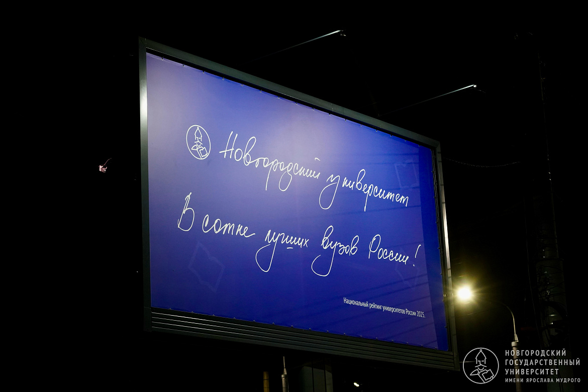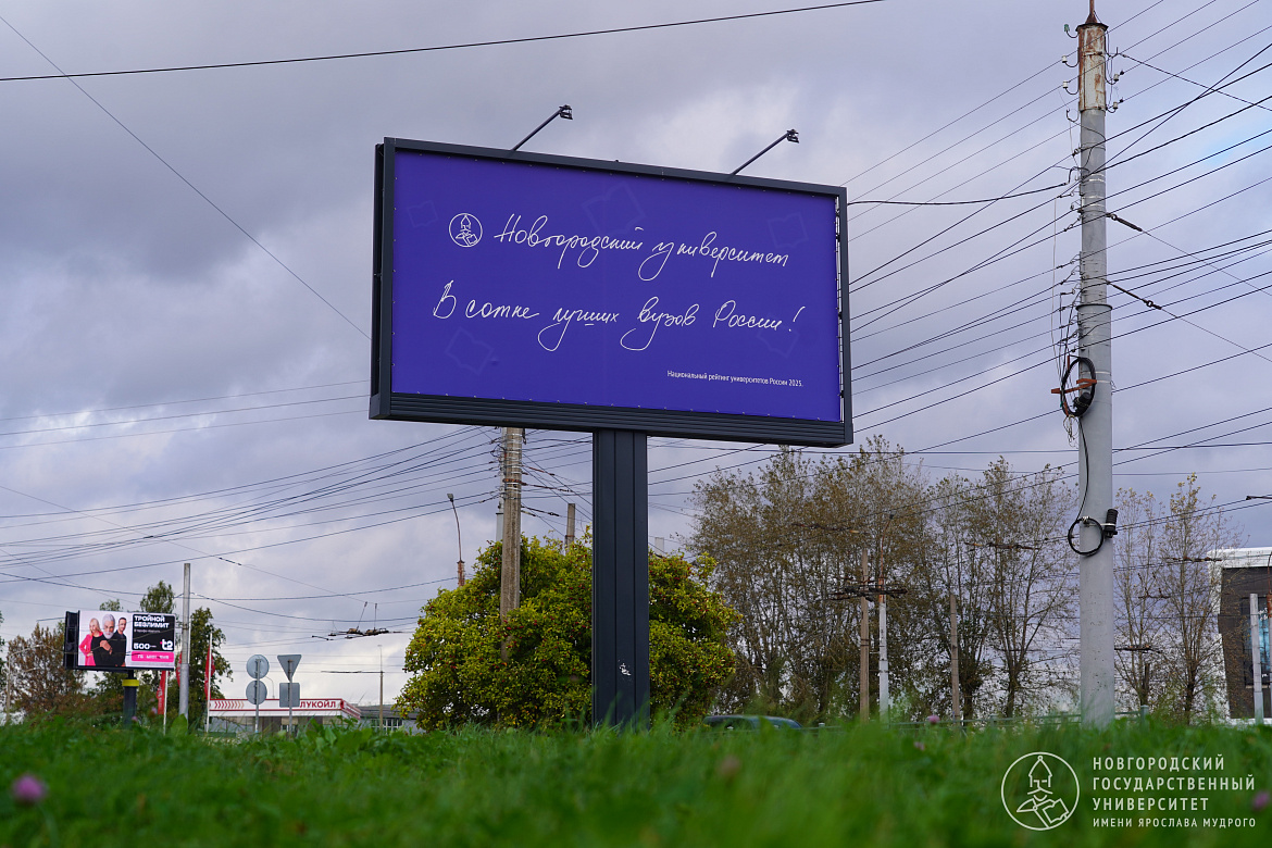 Также обновился уличный экран у административного корпуса НовГУ. На нём появилась надпись, выполненная рукой ректора Юрия Боровикова. Она сообщает, что вуз входит в сотню лучших университетов России.