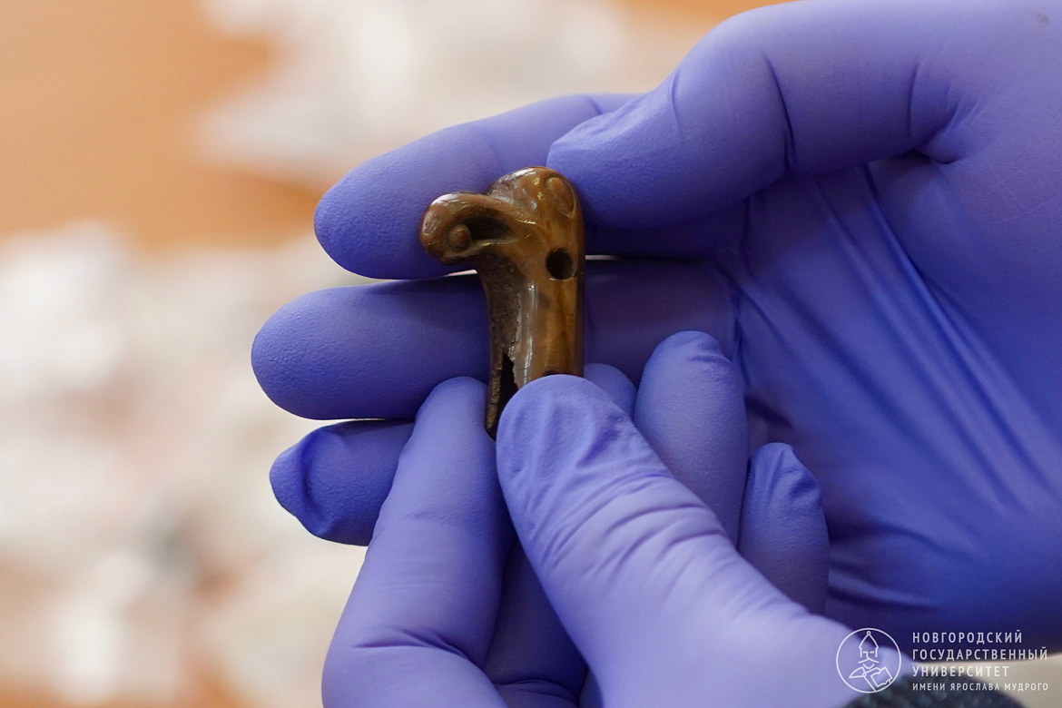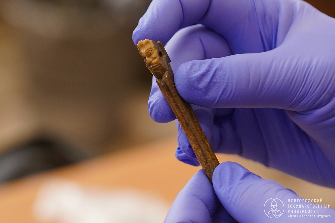 — В верхней части предмета мы видим тонкую, сложную резьбу, — пояснил директор Центра археологических исследований НовГУ Сергей Торопов. — С одной стороны вырезана некая «личина», то есть, лицо. С другой стороны — стилизованное изображение зверя с раскрытой пастью. Получается, как будто голова человека в пасти зверя. Символику этого изображения ещё предстоит выяснить искусствоведам. Мы можем предположить здесь отсылки к романскому стилю — возможно, вещь попала в Руссу из Европы. И для Старой Руссы, и для Великого Новгорода эта находка уникальна.