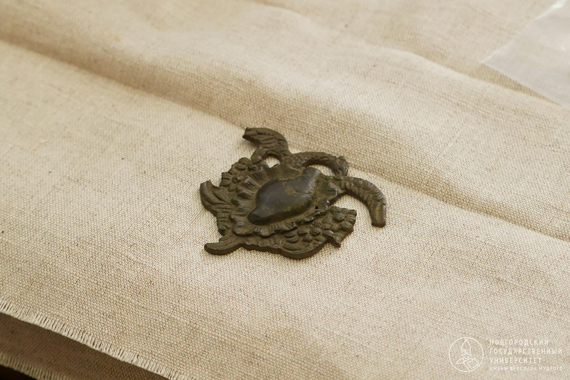 — Находки здесь — из поздних слоёв, предположительно, XIX — начала ХХ века, — отметил Сергей Торопов. — Например, довольно крупный наперсный крест — деталь облачения священнослужителей. Он немного погнут, но в целом в хорошей сохранности. Изначально это была довольно яркая вещь, покрытая цветной эмалью. Но в какой-то момент крест решили подновить и покрыли бронзовой краской. Здесь же был обнаружен любопытный нашивной металлический жетон с изображением пеликана, кормящего птенцов своим сердцем. Со времён раннего христианства он был символом самоотверженности и жертвенной любви. Во времена Российской Империи эта эмблема использовалась благотворительными учреждениями.