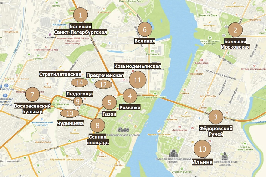 Карта представляет собой интерактивный PDF путеводитель по 14 историческим улицам Великого Новгорода. Включает Большую Санкт-Петербургскую, Большую Московскую, Фёдоровский ручей, Розважу, Газон, Великую, Воскресенский бульвар, Сенную площадь, Людогощу, Ильину, Козьмодемьянскую, Предтеченскую, Чудинцеву и Стратилатовскую.