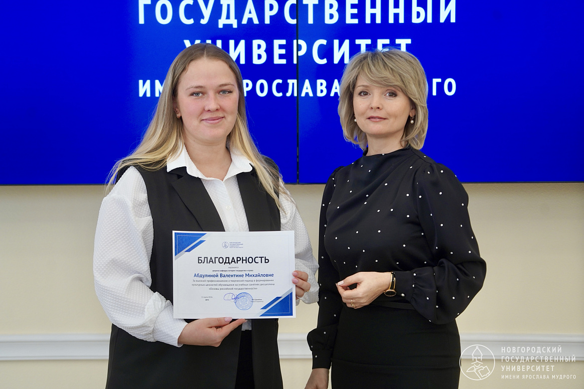 Также в процессе заседания состоялось торжественное вручение благодарственных грамот всем преподавателям курса «Основы российской государственности». Помимо Инны Митюновой и Алексея Савельева, награды получили: доценты кафедры истории государства и права Валентина Абдулина и Валентина Антонова, доценты кафедры философии и социологии Наталья Прокофьева, Татьяна Афанасьева и Всеволод Шипулин, доцент кафедры цифровой экономики и управления Надежда Гришакина, доцент и научный сотрудник кафедры культурологии Ирина Хвощевская, старший преподаватель кафедры теологического и исторического образования Евгений Зайцев, а также проректор по Молодежной политике НовГУ и завкафедрой правоохранительной деятельности, уголовного права и процесса Ольга Калпинская.