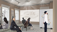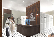 Проект предполагает оформление welcome-зоны – лестничной площадки и гардероба – в стилистике ХIХ века. Убранство эпохи студентка предлагает восстановить с помощью классических декорированных дверных наличников, ковров, паркета, потолочных карнизов, классической мебели. Выставочное пространство, посвященное истории здания, также стилизовано под ХIХ век.