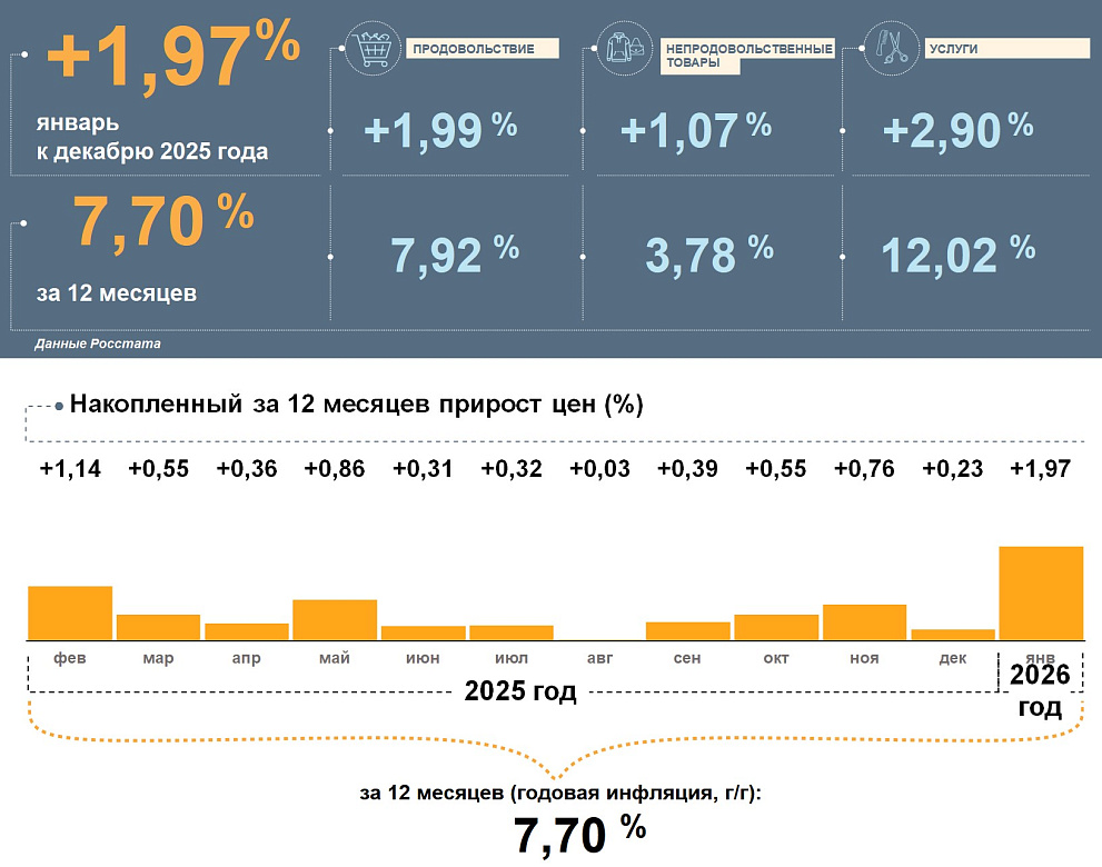 Цены в Новгородской области, по данным Росстата, в январе 2026 года выросли на 2% к декабрю 2025 года. Годовая инфляция в регионе увеличилась до 7,7% и оставалась выше, чем общероссийский показатель (6,0%).